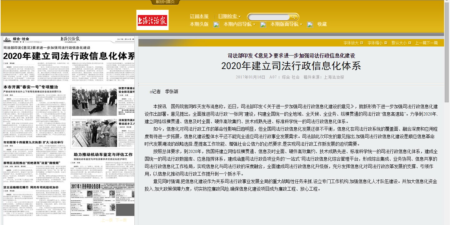 本报讯 国务院官网昨天发布消息称,近日,司法部印发《关于进一步加强司法行政信息化建设的意见》,就新形势下进一步加强司法行政信息化建设作出部署。意见提出,全面推进司法行政“一张网”建设,构建全国统一的全地域、全天候、全业务、纵横贯通的司法行政“信息高速路”。力争到2020年,建立网络纵横贯通、信息及时全面、硬件高效集约、技术成熟先进、标准科学统一的司法行政信息化体系。