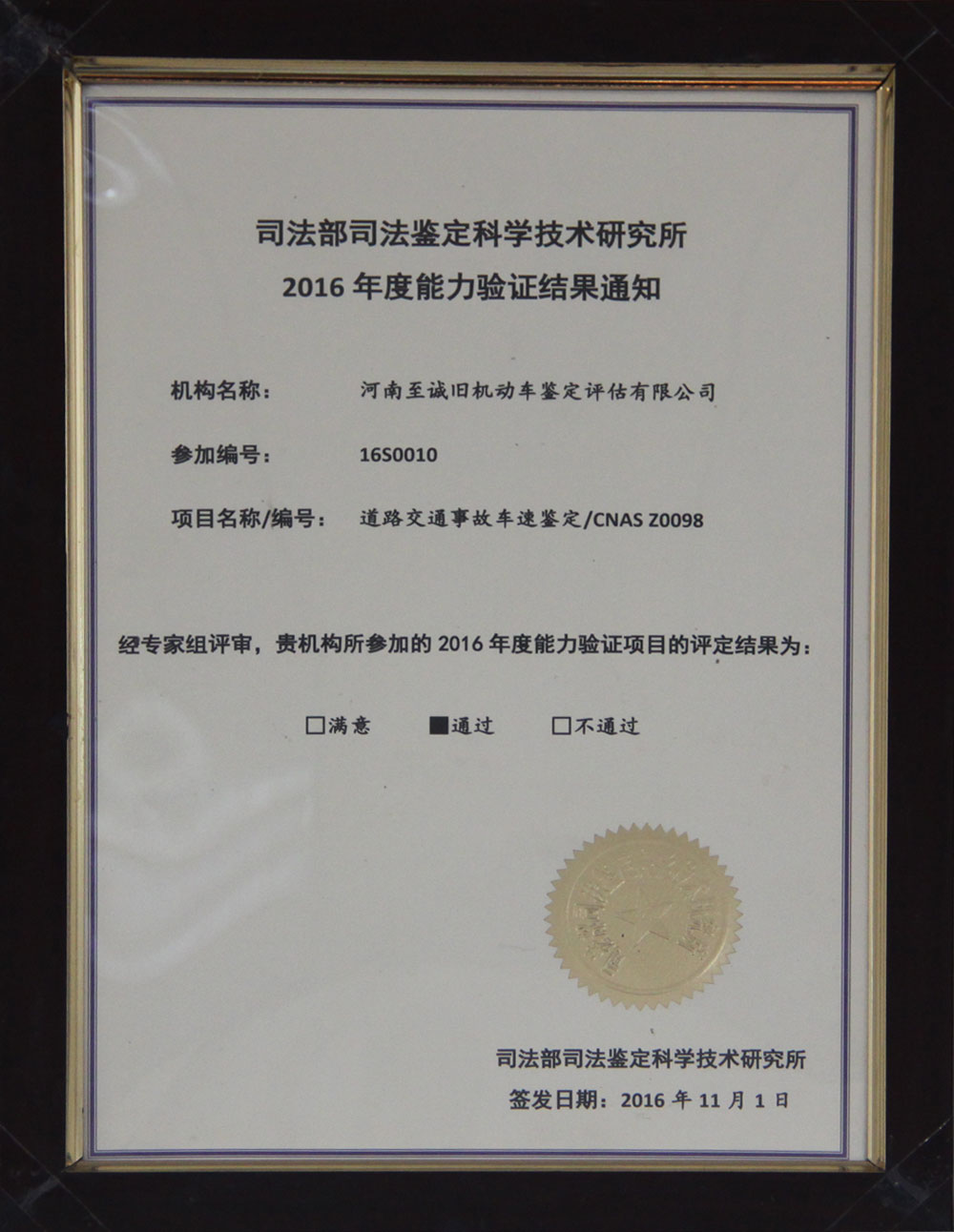 2016年度能力验证结果通知:道路交通事故车速鉴定