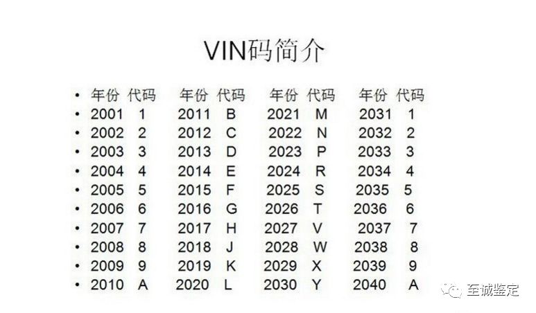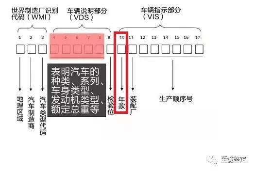 车辆识别码里面的每一个字符都有其独特的含义,具体的含义在下图中可以看到,我们经常用到的是看出厂的年款,也就是倒数第八个字符,根据实际的需要,出厂年款是按照30年一个循环的标示方法循环的,就和日常的十二生肖一样计算。
