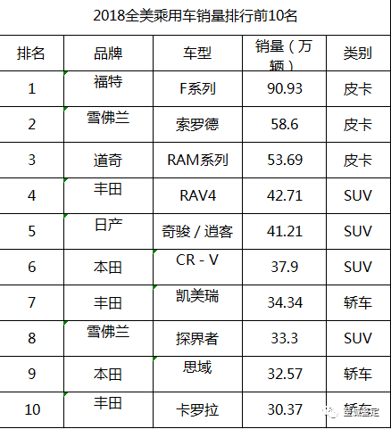 【环球网综合报道】 据美国媒体报道,近日2018年美国10大畅销车排行榜单出炉,如果将排名比作是对各车型的考验,那么轿车无疑是输家,SUV与皮卡毫无悬念地占据了压倒性优势。