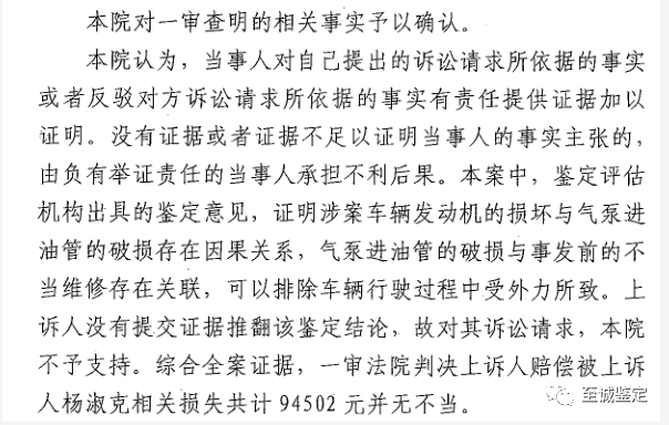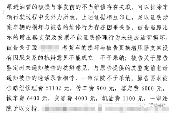 【庭审依据】2019年4月29日河南至诚旧机动车鉴定评估有限公司接受车主杨女士的委托,对该重型半挂牵引车的发动机损坏原因进行鉴定。鉴定人员现场查勘时发现气泵油管安装位置周围有其他管路或障碍物对该油管形成屏障,且外观完好未见撞击痕迹,排除气泵进油管的损坏是因车辆碾压外物弹起后撞击所致;观察发动机及附件未见有明显撞击痕迹,由此也可以排除发动机损坏是因其他部件破损导致润滑油流失造成的损坏。经过对发动机内部零件磨损位置以及油底壳沉淀的铁屑分析,确定发动机损坏是润滑不良造成的。通过对该车底盘油污痕迹进行分析,观察油迹形状并结合委托方提供维修时添加机油的升数,确定车辆在行驶过程中发动机润滑油存在连续性泄露现象。综合分析认为发动机是由于润滑油大量流失后导致机油压力不足造成润滑不良,致使机件异常磨损,可以排除是因发动自身机械性故障所导致。最终得出鉴定意见:确定发动机的损坏与气泵进油管的破损存在因果关系,气泵进油管的破损与事发前不正当维修存在关联,可以排除车辆行驶过程中受外力所致。